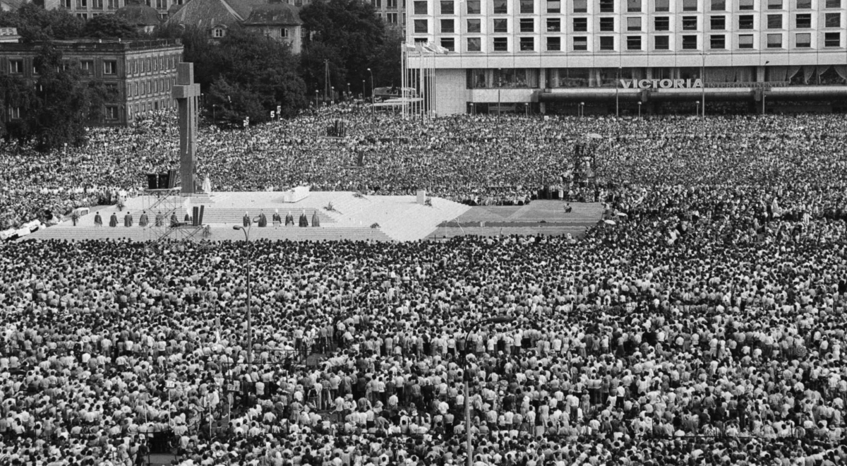 Podczas pierwszej pielgrzymki Jana Pawła II do ojczyzny wszędzie było mnóstwo wiernych witających papieża – rodaka. Znamienne słowa, które padły podczas mszy na ówczesnym placu Zwycięstwa w Warszawie, umocniły Polaków, a ponadto stały się wezwaniem do walki z komunizmem: „Wołam, ja, syn polskiej ziemi, a zarazem ja, Jan Paweł II, papież. Wołam z całej głębi tego Tysiąclecia, wołam w przeddzień Święta Zesłania, wołam wraz z wami wszystkimi: Niech zstąpi Duch Twój! Niech zstąpi Duch Twój! I odnowi oblicze ziemi!… Tej ziemi!”. Jan Paweł II odwiedził wtedy Warszawę, Gniezno, Częstochowę, Kraków, Kalwarię Zebrzydowską, Wadowice, Oświęcim, Nowy Targ i ponownie Kraków.
